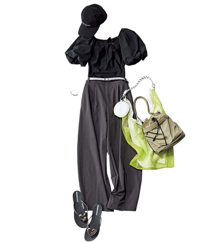水着[UVカット]¥18,700パンツ[2WAYストレッチ]¥23,100(ともにアルページュストーリー/アルページュストーリー プレスルーム)メッシュバッグ¥6,600(フリークス ストア/フリークス ストア渋谷)バッグ¥5,940(グリーンレーベル リラクシング/ユナイテッドアローズ グリーンレーベル リラクシング ルミネ有楽町店)ビーチサンダル¥3,300(イパネマ/シードコーポレーション)ベルト¥1,290(GU)キャップ[撥水]¥3,990(アンフィーロ)サングラス¥1,990(UNIQLO)バングル¥52,800(フォークバイエヌ/UTS PR)
