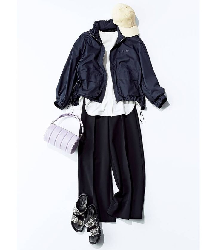 ブルゾン[ZERO-TEXⓇ/イージーケア]¥15,994(アウトドアプロダクツ × フリークス ストア/フリークス ストア渋谷)ノースリーブトップス[ソロテックスⓇ/速乾性・シワになりにくい・軽量]¥22,000(LE PHIL/LE PHIL NEWoMan 新宿店)パンツ[撥水・マシンウォッシャブル]¥28,600(アンクレイヴ)バッグ¥42,900(リンク)サンダル¥9,900(チャールズ&キース/チャールズ&キース ジャパン)キャップ[チャンピオン別注]¥3,850(ロペピクニック パサージュ)