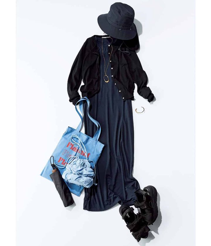 カーディガン¥4,499(ロペピクニック)ワンピース¥10,780(チャンピオン ブラック エディション/ヘインズブランズ ジャパン カスタマーセンター)バッグ[撥水]¥3,990(アンフィーロ)巾着バッグ¥1,990(GU)サンダル¥16,500(プラス ダイアナ/ダイアナ 銀座本店)ハット[遮熱・吸水速乾・接触冷感・UVカット]¥4,994(デッサン)傘[撥水・UVカット・遮熱]¥3,990(UNIQLO)ネックレス¥39,160〈ソコ〉バングル¥16,500〈エムシー・スタジオ〉(ともにZUTTOHOLIC)