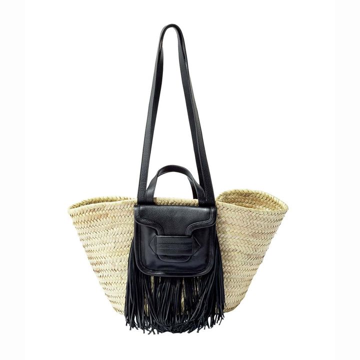 黒のフリンジ×バンブーハ ンドルがスタイリッシュな モード見えする大人のカゴ バッグ。