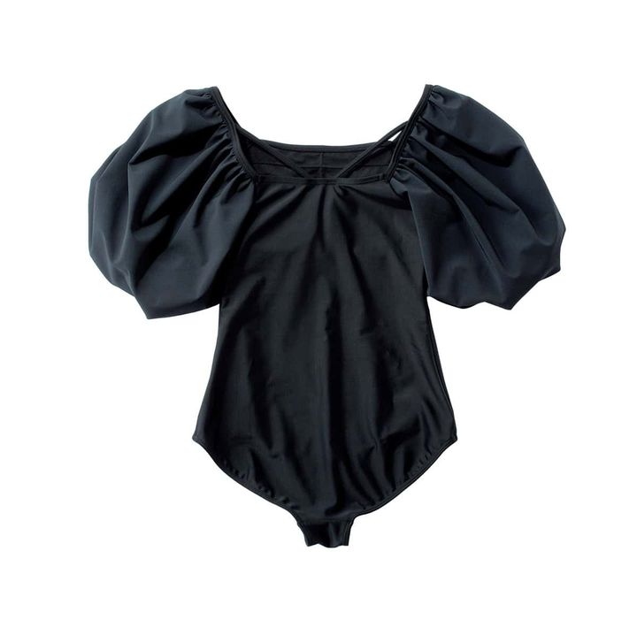 背中は見せつつ、二の腕をカモフラする大人可愛い盛り袖。水着[UVカット]¥18,700(アルページュストーリーオリジナル)