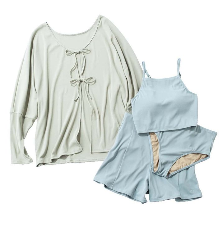 タウン使用もできる短すぎない丈感のオールインワンがありがたい。オールインワン[吸水速乾・UVカット]と水着の3点セット¥ 14,300(アパートバイ/アダストリア)