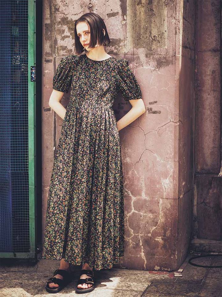 【POINT】ふくらんだスリーブと落ち着いた配色のクラシック感で夏の花柄をしっとりと。足元は重みを出せるダブルバックルのサンダルでバランス調整。