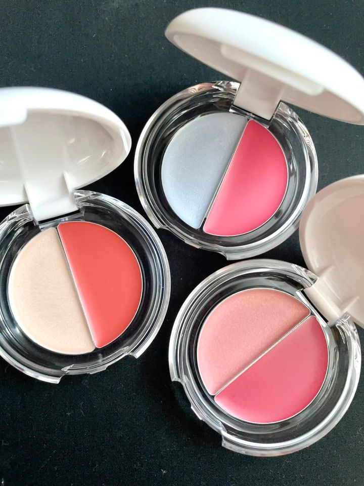 続いてご紹介するのは、ハイライト、アイカラー、リップ、チーク、さらには保湿バームetc. としても使えるマルチユースな2色セットのカラーバーム。少し難しそう?と思えるカラーも、実際につけると肌の上でふんわり透けるように発色し、自然な血色感や透明感を引き出してくれる万能アイテムなんです。べたっと色がのらず、発色のコントロールがしやすいのも素晴らしい! 単色で使っても、重ねても、2色を混ぜて使ってもOK。