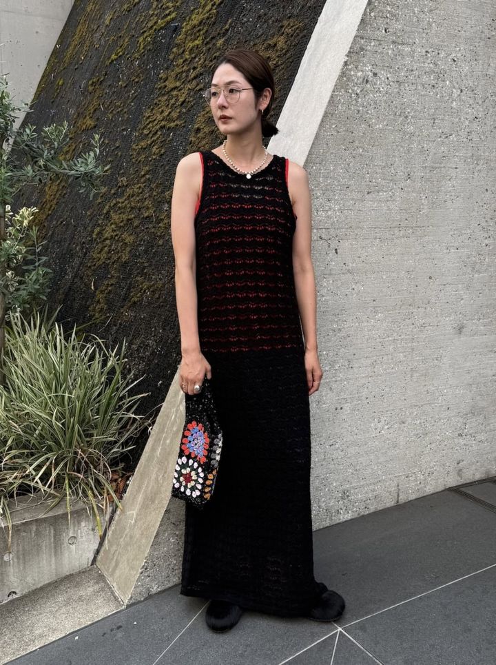 「単調になりがちな夏のスタイリングに、表情を与えてくれるお気に入りのニットワンピース。リラックスしたアイテム選びでもラフになり過ぎないよう意識しています。ワンピのクロシェットニットからのぞかせた、鮮やかな赤のシルクタンクトップがポイント。スタイリング自体はシンプルですが、足元にヘアカーフのシューズ、手元にはジュエリーのような存在感のある ASHISH のスパンコールバッグを合わせ、テクスチャーをレイヤードすることで華やかな印象に仕上げています」
