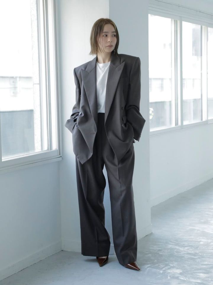 「マニッシュでいてクラシックなムードのセットアップにすることで、ラグジュアリーなジュエリーが映えるように意識しました。今まではストリート系のスタイリングが多かったですが、今季は大人っぽさを意識したい気分。セットアップは黒だと重くなるので、チャコールっぽいグレーのニュアンスのある色で、こなれた雰囲気に仕上げました」