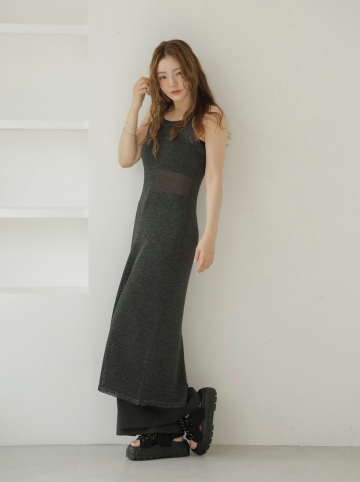 「夏の肌見せはカジュアルなムードで楽しみたいので、透け感がヘルシーなニットワンピにパンツをレイヤードしちょうどいいバランスに。キラキラ感をほんのり目元に足したり、日焼け肌っぽいチークなど、ヘアメイクで夏っぽく盛り上げました」