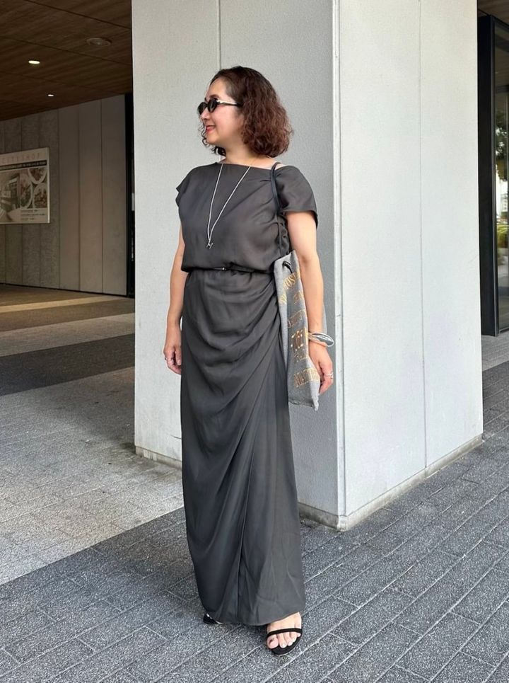 「まだまだ暑い夏日が続くので、ほどよく肌見せできてからだが泳ぐ、カジュアルすぎないワンピースが重宝します。今回は、ジャケットを羽織れば秋の始まりまで着られるモーブなグレートーンを選びました。私は小柄なので、丈感調節と目線アップできる小物としてバックルのあるベルトを使用しシックにまとめています。ベルトや太目のバングルでモードさを、バッグで遊びをプラスしているのがポイントです。バッグは大人気manipuriの秋冬もの。色や素材感が◎」