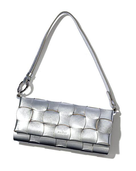 幅広のレザーを編み込むことで、光の反射を複雑に。さらりと持つだけで洒落た雰囲気を出せる横長フォルムは、今季のトレンド大本命です♪