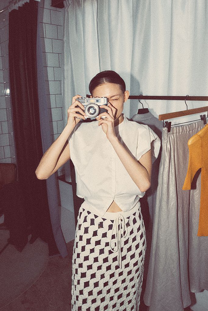 白コンパクトシャツ/TODAYFUL(Life’s 代官山店) 白ニットスカート/サヤカディヴィス(ハウス オブ ロータス 二子玉川店) デニムパンツ/beautiful people(ビューティフルピープル 伊勢丹新宿店) カチューシャ/ALEXANDRE DE PARIS(アレクサンドル ドゥ パリ GINZA SIX店)