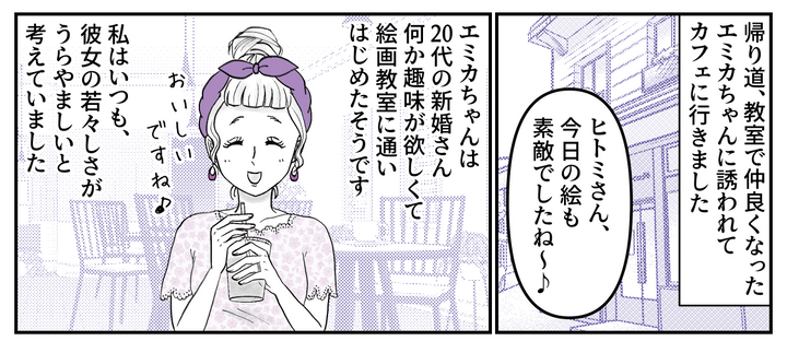 私はヒトミ、50歳のパート主婦です。息子はひとり暮らしの社会人、娘もこの春大学を卒業して家を出ていったため、夫婦だけの静かな生活になりました。それ以来、私はなんだか心が空っぽ。カフェで会った同級生のチトセには「やりたいこと」を見つけてみたらと勧められました。するとそんなとき、カルチャーセンターの絵画教室の看板を見つけます。私は中高生の頃に美術部で楽しく活動していたことを思い出し、思い切って通いはじめたのでした。