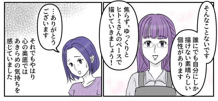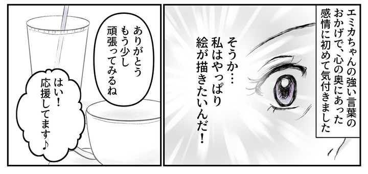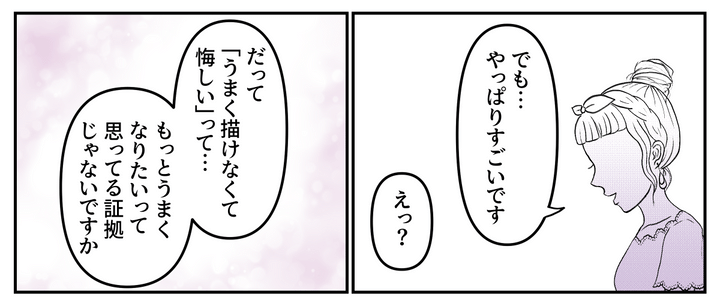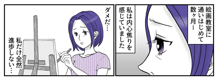 空っぽの心を抱え、何か打ち込めるものを見つけたいと思って通いはじめた絵画教室。なかなか思うように描けない私は、挫折しそうになっていました。しかし思わず弱音を吐くと、エミカちゃんは「悔しいと思えるのは本気の証拠」と言ったのです。