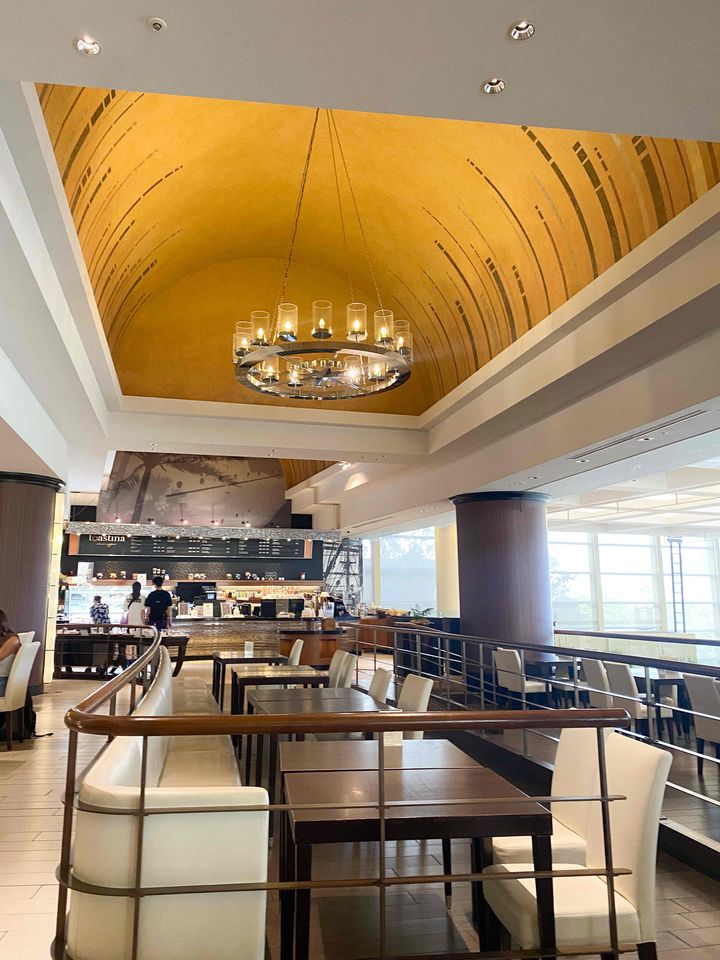 ショーケースにはホテルメイドのケーキのほか、サラダやおにぎりなどの軽食も並んでいました。プールやランド・シーで疲れた身体を癒してくれそう。