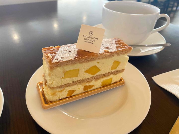 「マンゴーのミルフィーユ」は、とろとろのマンゴーの果肉がぜいたくに入り、クリームもマンゴー風味。ほろほろ薄めのパイ生地とたっぷりのクリームとあわせると口の中が幸せでいっぱいになりました。