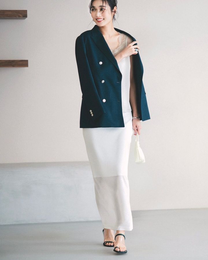 8月25日(月)、レースのキャミソールがほんのりセンシュアルなムードを漂わせる一方、白のロングスカートは裾のシアー切り替えで軽さと今っぽさを演出。ワントーンでまとめながらも異素材の組み合わせで奥行きを出し、シンプルながら洗練された印象に。ネイビーのダブルジャケットを肩掛けすれば程よいマニッシュさが加わり、白とのコントラストで清潔感と引き締め感を両立。都会的な大人の装いに。