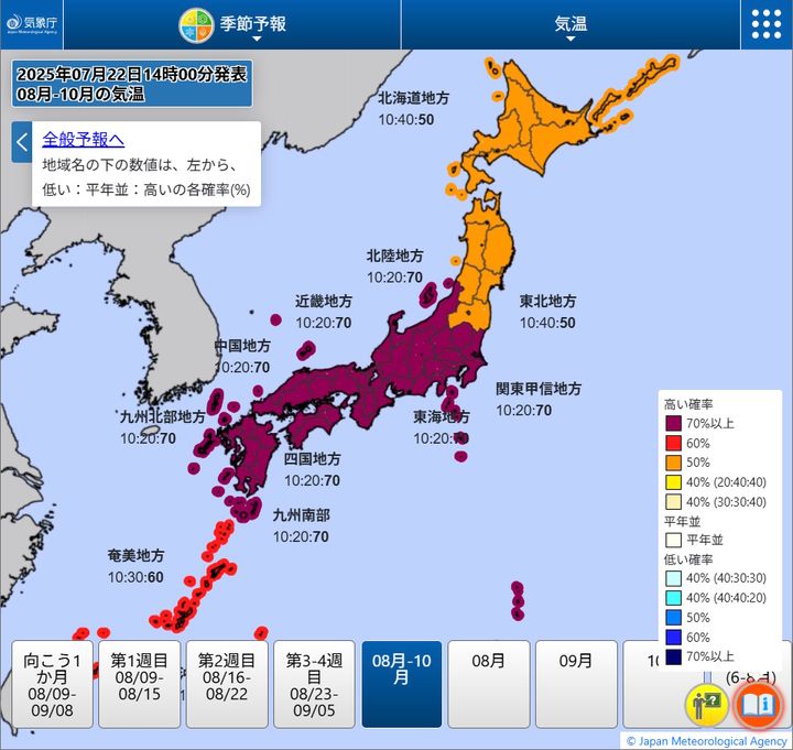 さらに、気象庁による「3か月の季節予報(7月22日発表)」では、平年より気温が高くなる可能性が北海道・東北で50%、奄美・沖縄で60%、関東甲信・東海・北陸・近畿・中国・四国・九州北部・九州南部で70%となっています。