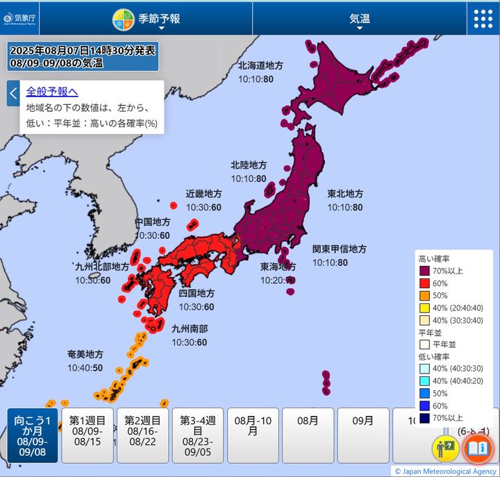 2025年は、秋も引き続き記録的な暑さとなる可能性があります。気象庁による「1か月の季節予報(8月7日発表)」では、九州から北海道にかけて平年より気温が高くなる可能性が高いとされています。