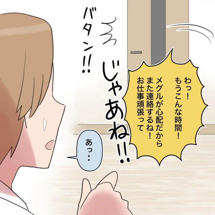 「わっ!もうこんな時間!メグルが心配だからまた連絡するね!お仕事頑張って」そう言いながら、とっとと家を出て行くマホさんに、「あっ・・」と驚くオサムさんでした。
