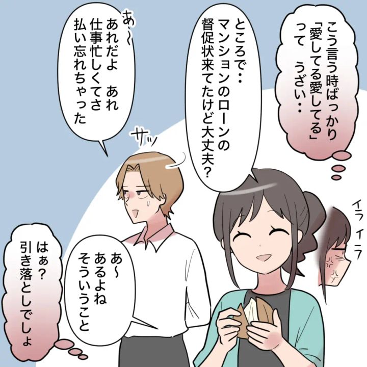 「こういう時ばっかり『愛してる愛してる』ってうざい・・」と思いつつ、「ところで・・マンションのローンの督促状来てたけど大丈夫?」とたずねると、「あ~、あれだよ、あれ。仕事忙しくてさ。払い忘れちゃった」と答えるオサムさん。「あ~、あるよね、そういうこと」と言いながら「はぁ?引き落としでしょ」とマホさんは内心不満タラタラ。