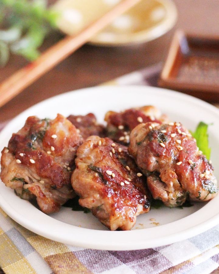 @ai.ouchigohan さんの「大葉入り豚こまつくね」は、豚こまに焼き肉のタレなどを揉み込み、フライパンで焼くだけ。