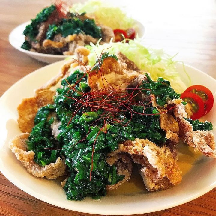 カラッと揚がった唐揚げと、たっぷりのネギが食欲をそそります。千切りキャベツやトマトを添えれば、これだけで大満足間違いなしです!
