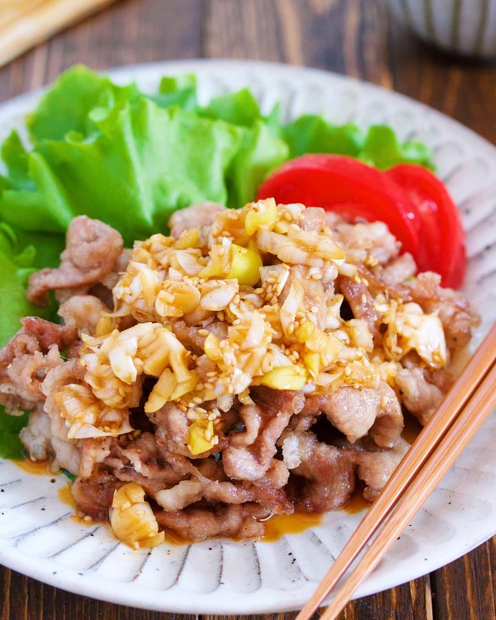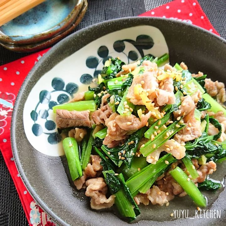 @yuyu_kitchen さんは、豚こまと栄養価の高い小松菜を炒め合わせ、スタミナ満点のひと皿に。生姜の効いたしっかり味だから、ごはんがモリモリ進んでしまいそう。