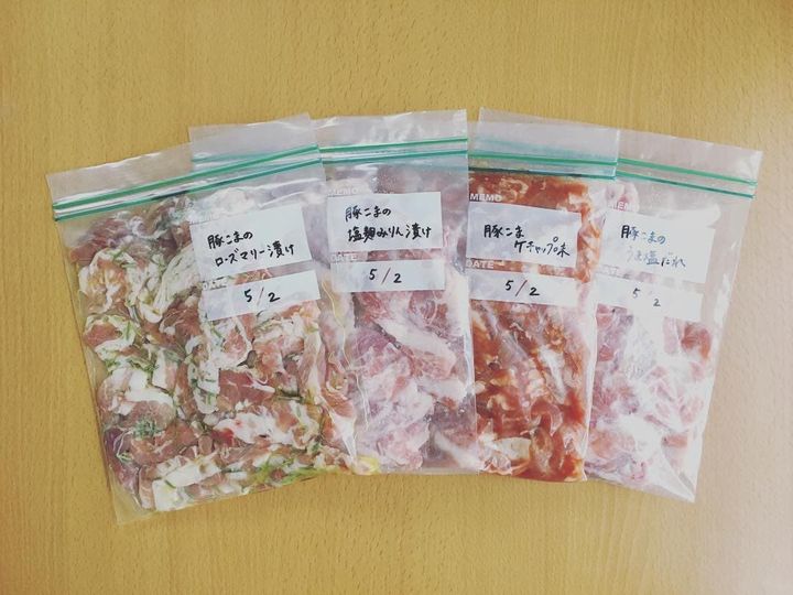 「豚こまのローズマリー漬け」や「豚こまの塩麹みりん漬け」などいろいろなバリエーションの下味冷凍をしておけば、飽きずに楽しめますね。