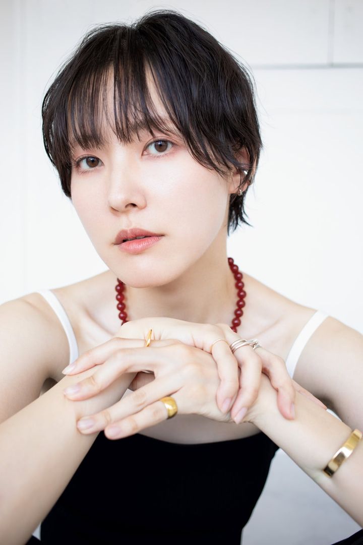 「手元のジュエリーは、ゴールドとシルバーのシンプルな地金なので、遊び心のあるネックレスもおしゃれかつ大人なバランスで受けとめてくれます。メイクの印象が強くなるアフター5は、大ぶりのシルバーピアスでピリッとスパイスをプラス」右手:blanc irisのダブルリング、左手:人差し指にしたgoen°のリング、小指にしたBYOKAのリング、AFTER SHAVE CLUBのバングル、TODAYFULのピアス、KNOWHOW JEWELRYのイヤーカフ、LIÉ STUDIOのネックレスは全て本人私物
