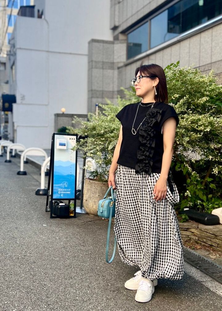 週末の大阪・本町でショッピング中のなみさん。アシンメトリーにフリルを配したトップスに、ボリューム感のあるギンガムチェックのサスペンダースカートがよいバランス。「学生時代の先輩でモデルの上野朋子さんがブランドディレクターをつとめられている「sync(シンク)」がお気に入りなんです」。シンプルなのに華やかさのあるアイテムは、着回しもできて重宝!