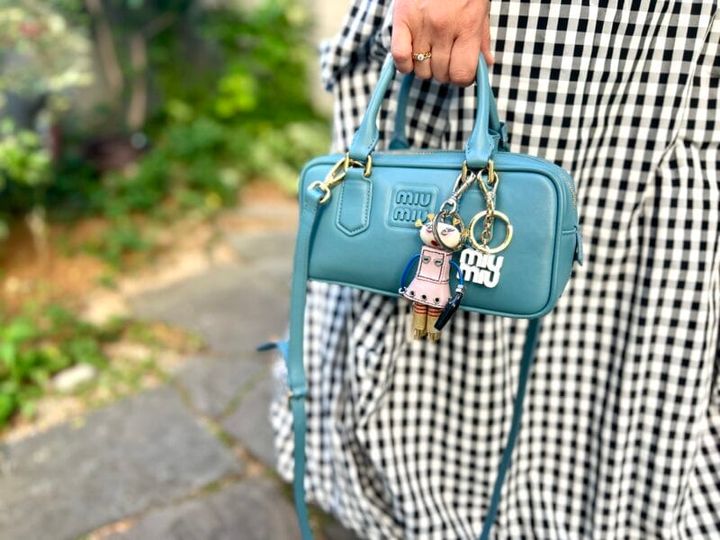 横顔にちらりと見えるティファニーブルーが印象的なメガネに、「ミュウミュウ」のブルーのミニバッグをカラーでリンクコーデ。お気に入りのチャームも愛嬌たっぷり。