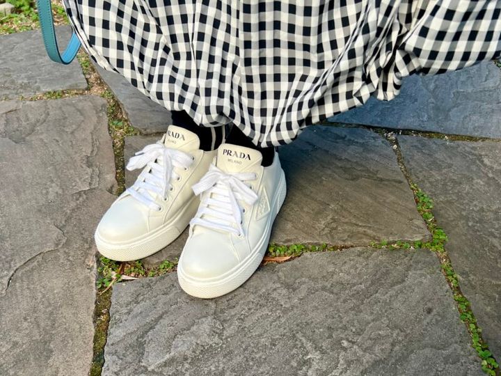 足元は、「プラダ」の白スニーカーで夏らしくさわやかに。黒を選ぶと、全体がまた違った印象になりそう。