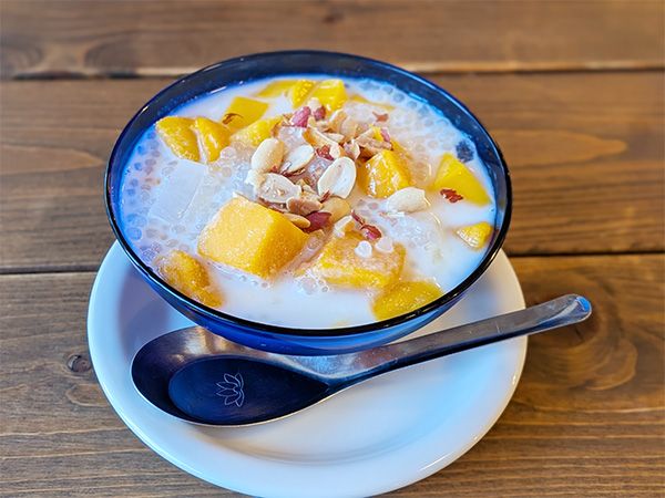 「チェー」はベトナムの定番デザートです。この時はマンゴーのチェーのみでしたが、時々で別のフレーバーもあるそうです。ココナッツミルクの中にマンゴー、タピオカ、クラッシュした氷が入っていて、トッピングのピーナッツと一緒に食べると口の中が楽しいハーモニーに満たされます♪