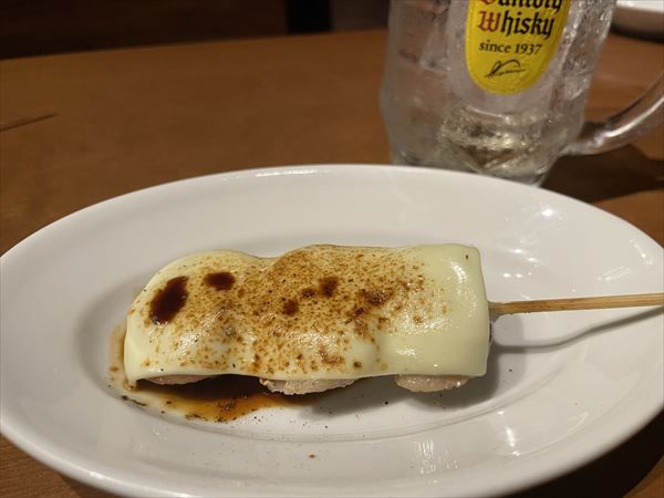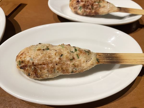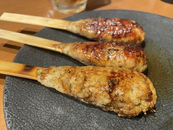 「つくね 塩」(231円)。「焼き鳥越智」のつくねはふわっふわな口当たりなんです。小さく小さく刻まれた軟骨が入っていて楽しい食感でおいしい一品。