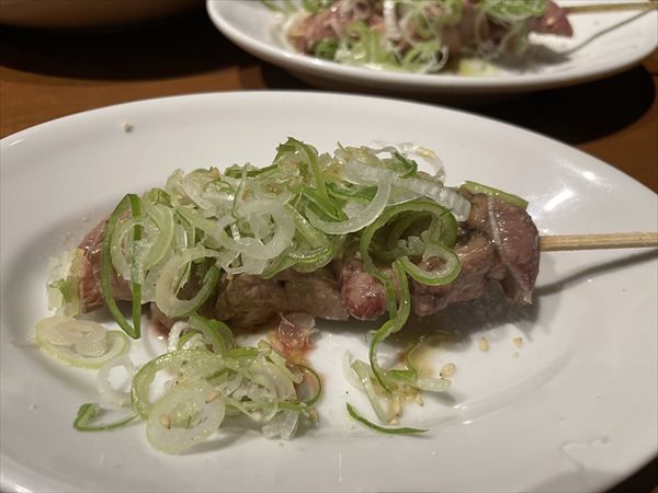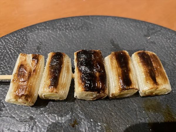 次は「京ネギ」(198円)。炭火で焼いた京ネギをシンプルに塩でいただきます。ネギの甘さが引き立っており、筆者は「とりもも」と一緒に食べて、「ねぎま」気分でいただきました。