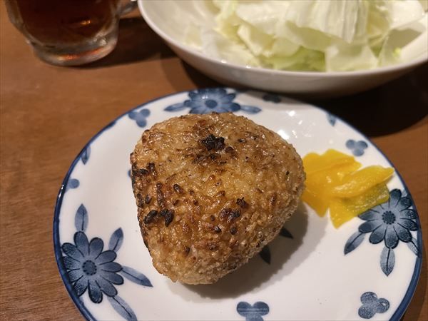 「焼きおにぎり」(275円)。個人的には大好きな焼き加減とお味。表面は醤油がぬられたカリッカリの食感、中はフワフワのお米。炭火で焼かれたたまらない香りと味、ん〜めっちゃおいしい!