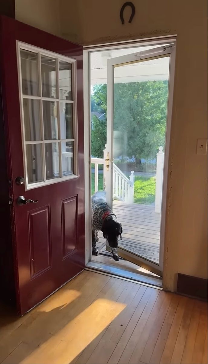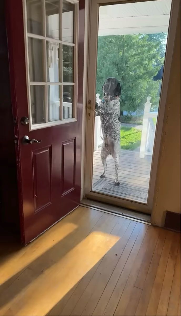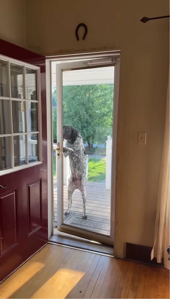 玄関のドアの向こうにいたのは、後ろ足で立ち上がっているクーンハウンド。 この子は、慣れた手つきで驚きの行動に出ました!