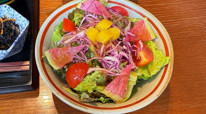彩りが綺麗なサラダ!黒酢ドレッシングが珍しい♪
