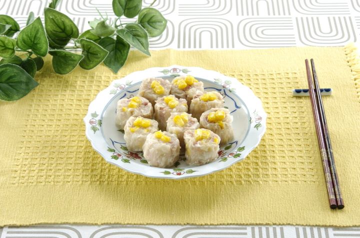 (4)(3)をシュウマイの皮で包み、残しておいたとうもろこしに片栗粉小さじ1/2をまぶしてのせ、蒸気の上がった蒸し器で強火で8分蒸す。