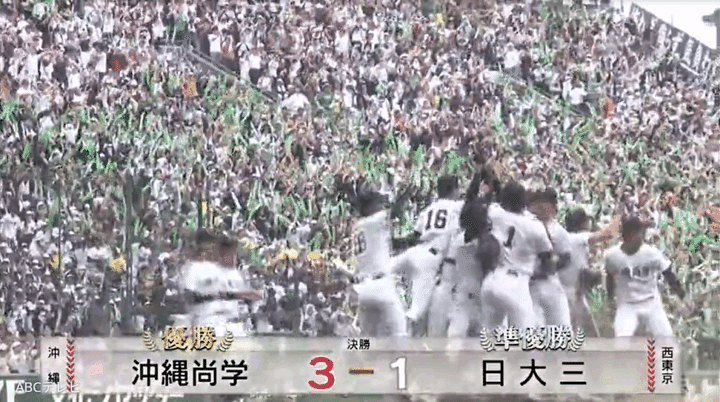 沖縄尚学が夏の甲子園で優勝するのは今回が初めて。沖縄尚学ナインは、優勝投手となった末吉投手に抱き着いて大喜びし、同校側のアルプススタンドやパブリックビューイング会場は、歓喜の指笛と拍手でお祭り騒ぎに。戦後80年の節目である2025年に、沖縄尚学は多くの人々に感動を与えた。