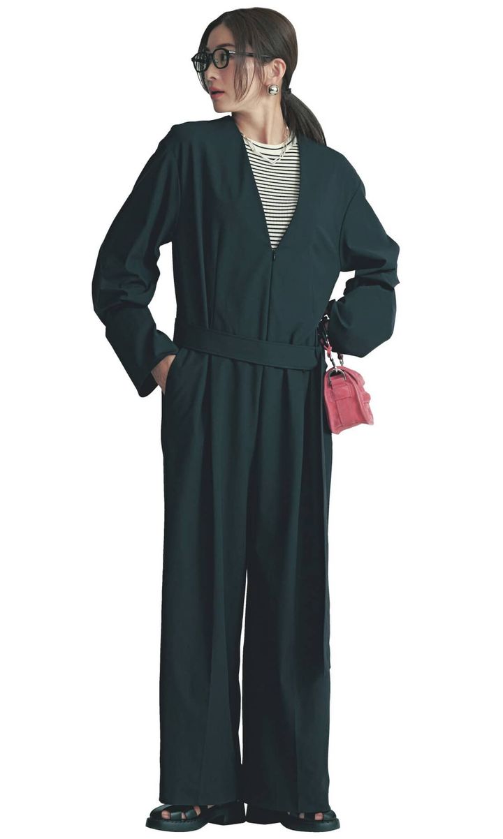 襟つきでクールにキマるオールインワン。1枚着るだけで一気に大人な女性に。ハリのある素材やジャケット×パンツの切り替えシルエットは、スタイルよく見せてくれそう。きちんと感満載で、オフィスや子どもの学校見学などにも着ていきたい。