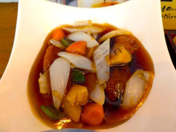 玉葱・タケノコ・人参・ピーマンの野菜がゴロゴロ入ったとろみのある甘酸っぱい餡に、外はカリカリで中は柔らかい豚肉がおいしい酢豚です。ご飯ともよく合います。
