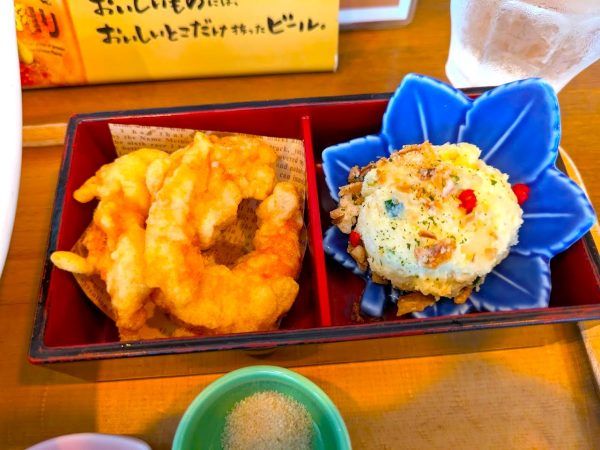 おばんざい2品は、えび天と綺麗なポテトサラダ。このえび天はやめられないとまらない味のえび天です!