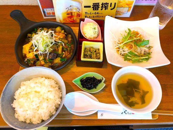 日替りランチ 880円 日替りランチは、ふわふわタマゴの麻婆茄子のせに、おばんざい2品・漬物・スープ・ご飯付きです。