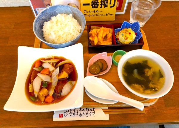 「すぶたランチ」酢豚・おばんざい2品・漬物・スープ・ご飯、979円
