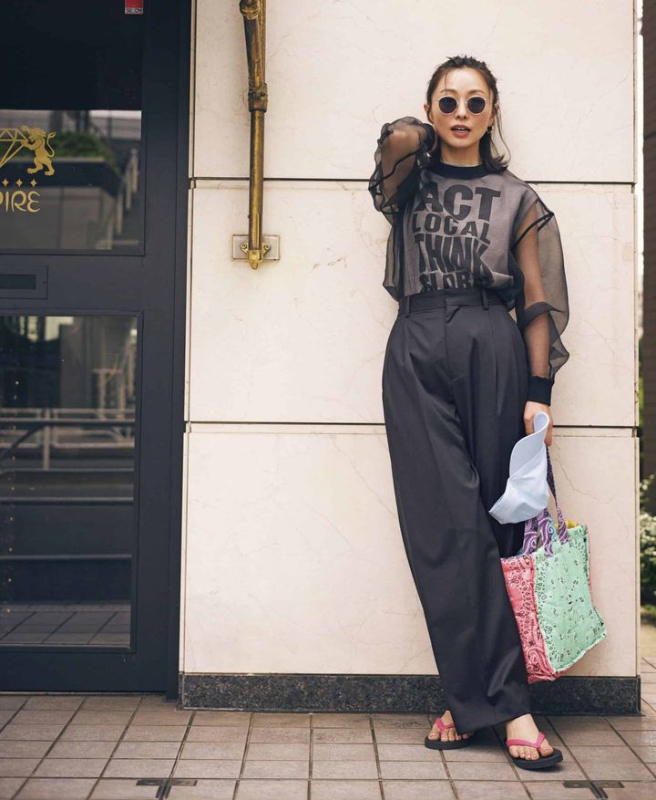 シンプルな黒ワンピースも、シアーシャツを重ねるだけで今っぽさ抜群のコーデに。ともすればご近所コーデになってしまいそうな楽ちんワンピ×ビーサンも、お出かけ仕様にシフトします。