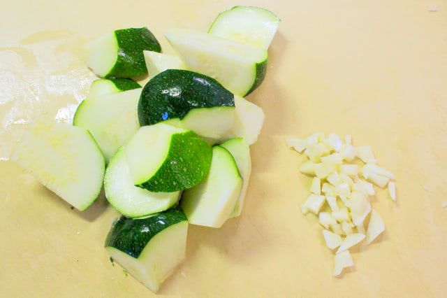 2. ズッキーニは乱切りにして、サッと洗って水気を拭きます。にんにくは、粗みじん切りにします。