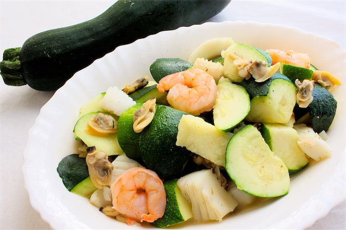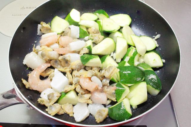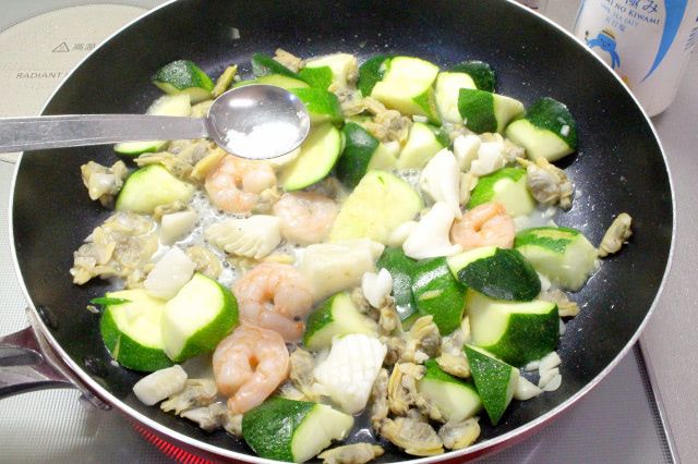 にんにくとズッキーニを先に炒めてから、シーフードミックスを加えると、身の縮みを抑えられますよ。