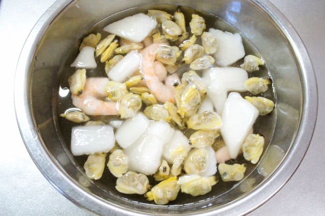 今回使ったシーフードミックスは、エビとイカが大きいタイプ。水に5分ほど浸けて解凍しました。
