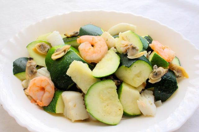 ズッキーニは淡泊な味わいですが、シーフードミックスのエキスを吸って、濃厚な味わいに仕上がりましたよ。