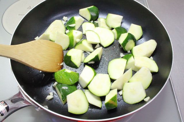 にんにくは焦げやすいので、弱めの中火で炒めます。今回、3分ほど炒めましたが、にんにくの香りは立つものの、ズッキーニに焼き色は付きませんでした。